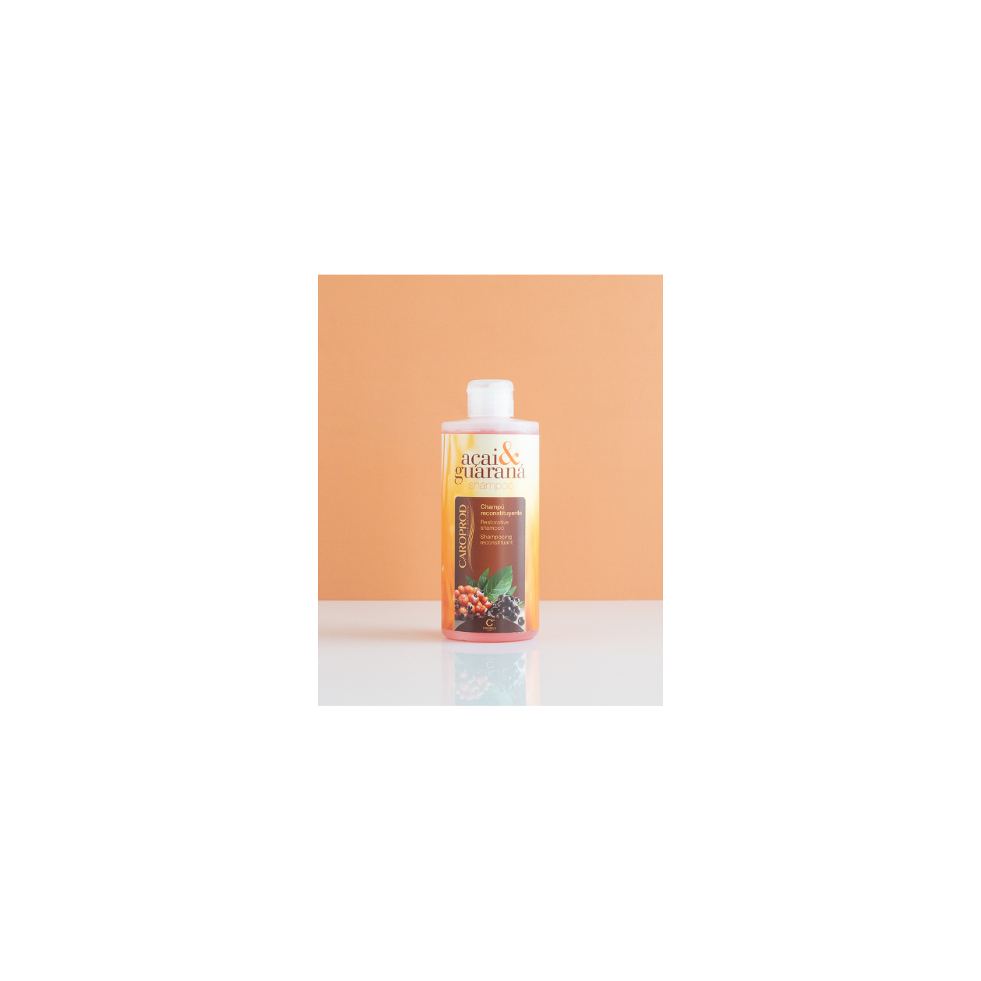 Champú reconstituyente. Champú energizante con Açai y Guaraná. Limpia suavemente y en profundidad, ayudando a eliminar la grasa fácilmente, al mismo tiempo que tonifica el cuero cabelludo. 450ml Aplicar sobre el cabello húmedo hasta obtener abundante espuma. Emulsionar y aclarar.