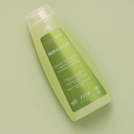 El champú para pelo graso TricoVIT Regulative limpia y regula la secreción de las glándulas sebáceas. Inhibe la proliferación microbiana actuando de forma selectiva frente a los microorganismos patógenos, respetando la flora microbiana natural del cuero cabelludo. Conserva y restaura la película hidrolipídica protectora del cabello.