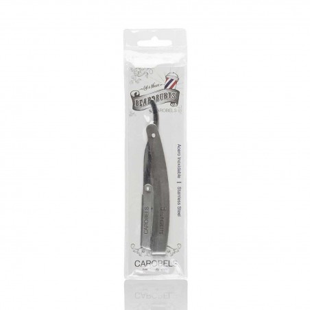 Modo de empleo Antes de usar la navaja en cada corte, es necesario un afinado de la cuchilla con el afilador adecuado. Abrir la navaja hasta que el mango quede en posición vertical y la cuchilla en horizontal. Con la hoja paralela a la cara, coger la navaja con el dedo pulgar por debajo, el dedo índice por encima y el anular al otro lado del mango. Para un resultado óptimo, hacer un primer afeitado de arriba abajo en dirección al vello, y posteriormente un segundo afeitado de abajo a arriba en sentido contrario a la dirección del pelo. Tras su uso, lavarla y secarla para el buen mantenimiento. Navajas de afeitar Beardburys Además de la Navaja de barbero Inox Safe, Beardburys tiene en su línea otras dos navajas para el afeitado: La Navaja de barbero Deluxe, con mango madera y estuche protector. La Navaja de barbero Eco Safety con sus cuchillas intercambiables.