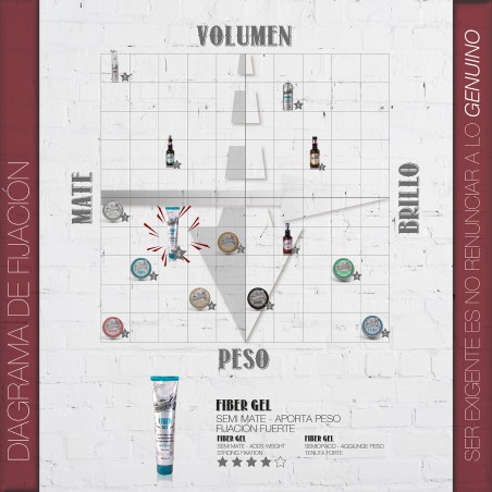 Gel de fibras con fijación firme y flexible de larga duración y acabado semi mate. Aporta textura al cabello. No deja residuos y se elimina fácilmente con agua.