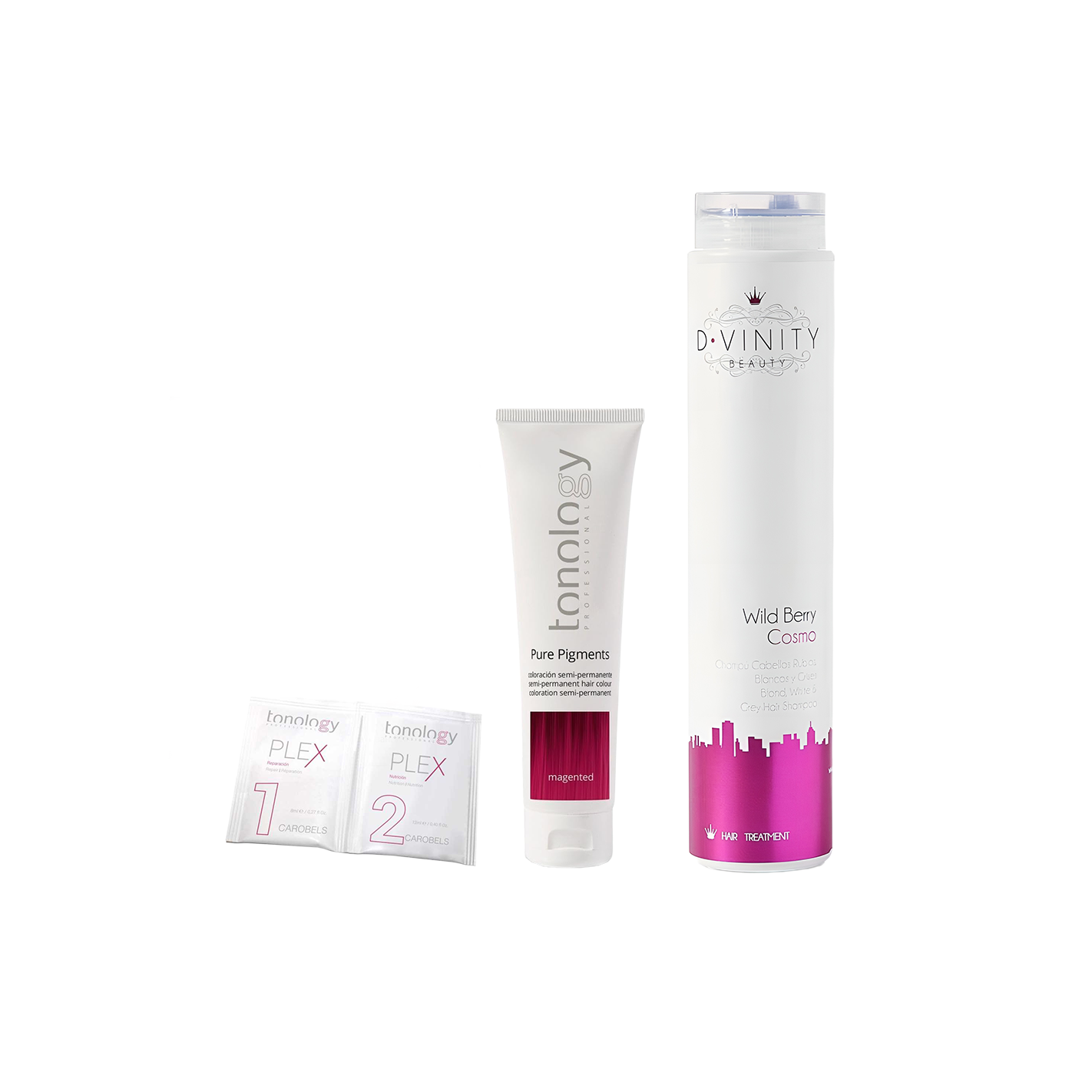 Déjate seducir por la intensidad del Pack Fantasía Tonology Magented, una combinación perfecta para lograr un tono rosa profundo y vibrante. Incluye el tinte Pure Pigment Magented, una emulsión activadora de 20 volúmenes, el champú Wild Berry Cosmo para prolongar la duración del color y el Dose Kit Plex para proteger la fibra capilar. Todo lo que necesitas para un rosa de impacto con un acabado profesional.