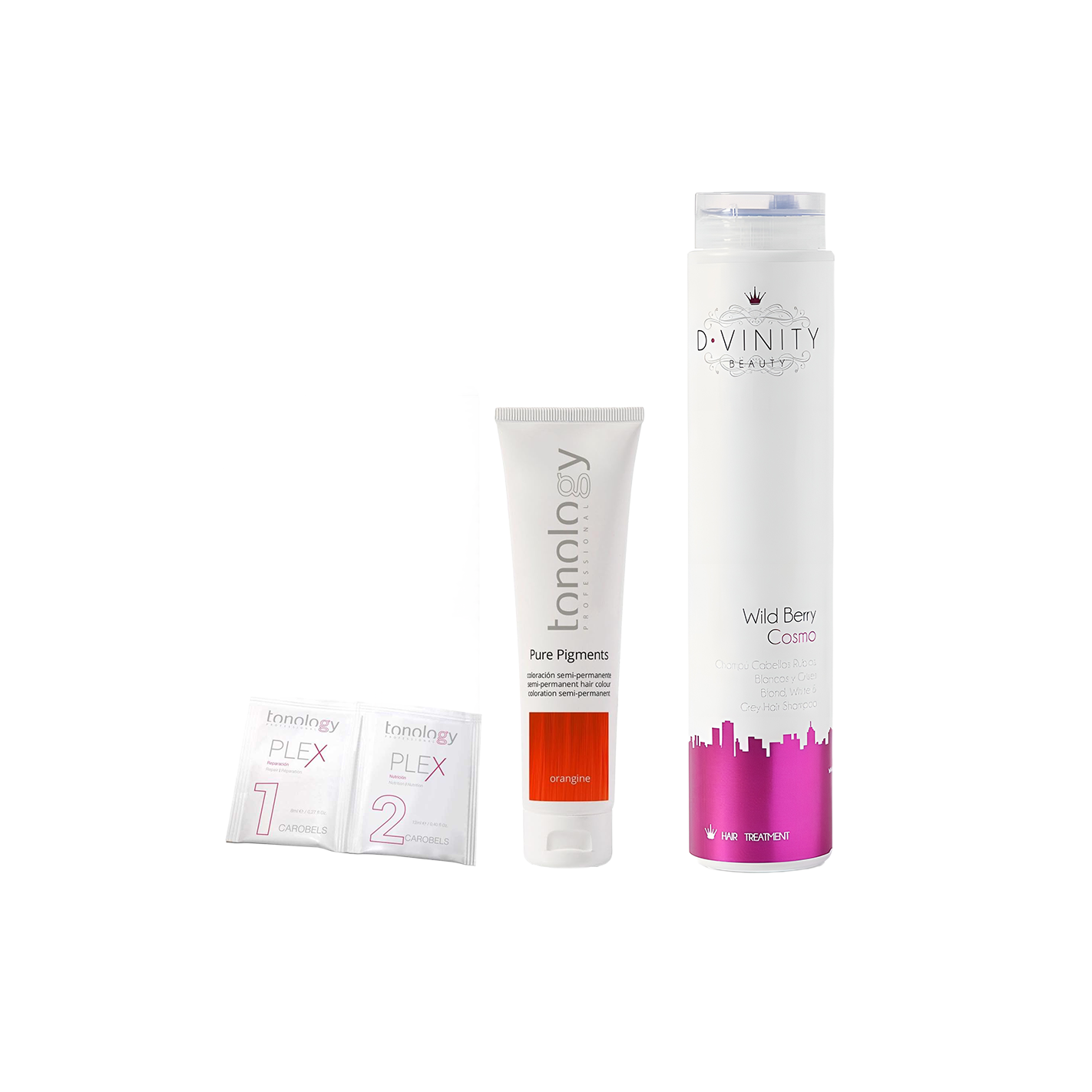 El Pack Fantasía Tonology Orangine es ideal para quienes buscan un color naranja fantasía potente sin dañar la fibra capilar. Contiene el tinte Pure Pigment Orangine, altamente pigmentado para un resultado lleno de vitalidad; una emulsión activadora de 20 vol (80 ml) para fijar el color de forma efectiva; el champú Wild Berry Cosmo (250 ml) que prolonga el brillo y la intensidad; y el Dose Kit Plex, que actúa como escudo protector durante el proceso. Un combo profesional para un naranja irresistible.