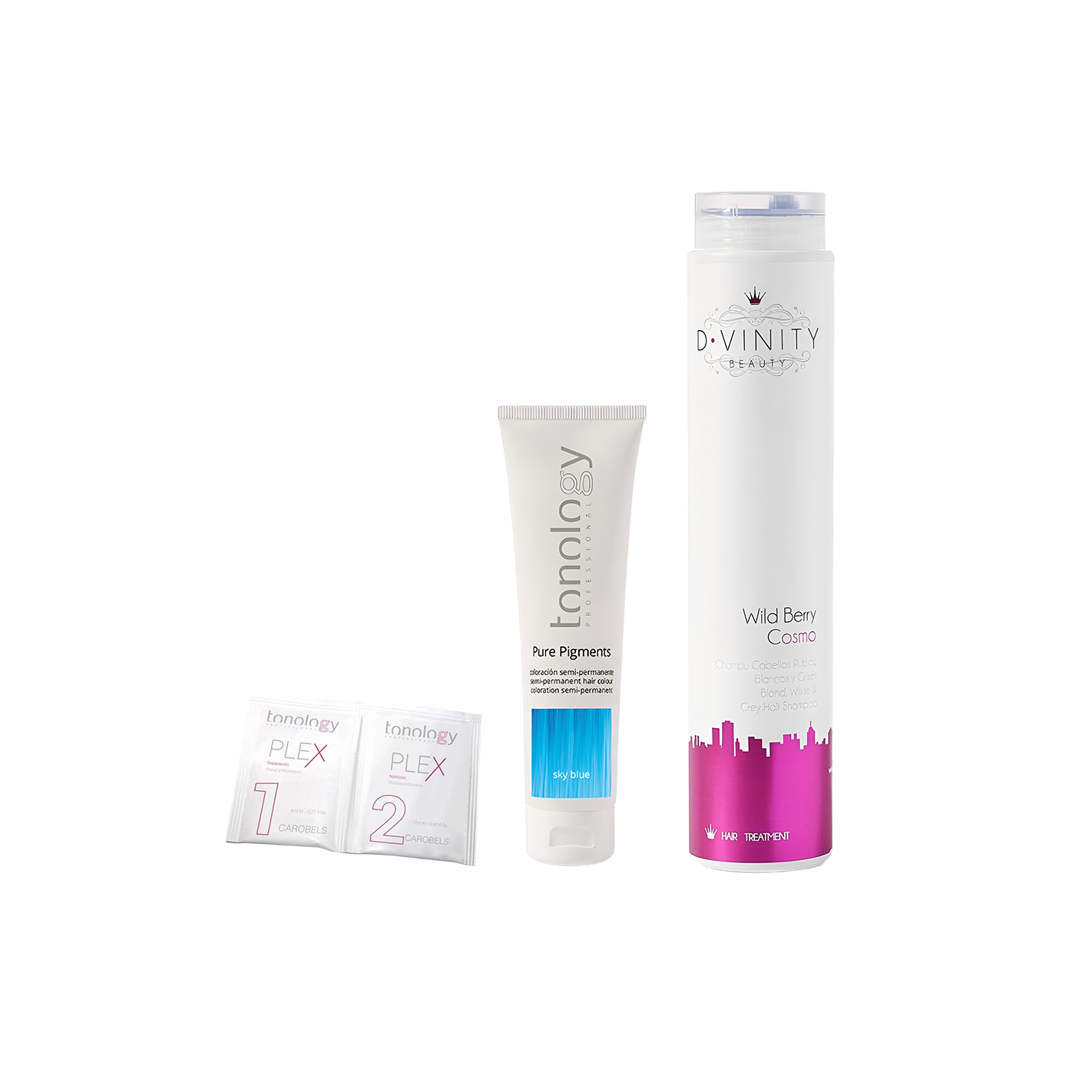 Consigue un color vibrante y duradero con el Pack Fantasía Tonology Sky Blue, que incluye un tinte profesional en el tono Pure Pigment Blue Shapphire, emulsión activadora de 20 volúmenes para una fijación perfecta, champú Wild Berry Cosmo que protege y prolonga el color, y el Dose Kit Plex que fortalece la fibra capilar durante y después del proceso. Todo lo que necesitas para un azul de impacto y un cabello sano.
