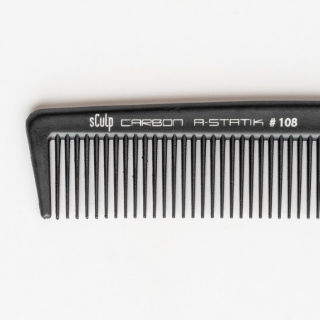 Peine de carbono ultrarresistente que evita la electricidad estática en el cabello. El peine de carbono A-Statik de Sculp ha sido diseñado con púas redondeadas para evitar la ruptura del cabello. Es resistente al calor y a productos químicos como tintes, permanentes, decoloraciones...