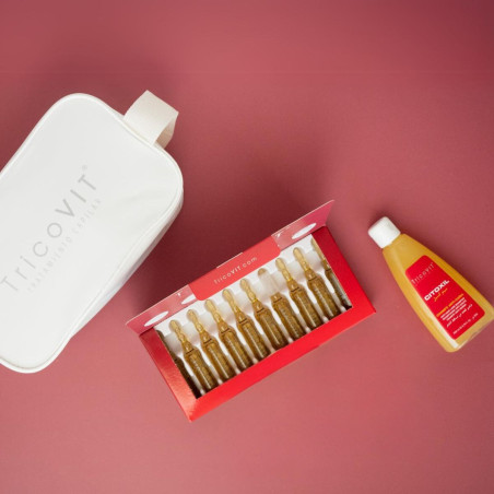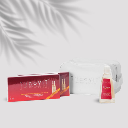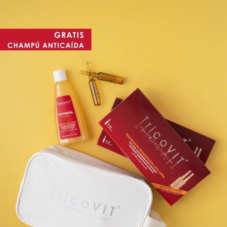 Este Pack contiene dos Estuches de Viales anticaida Tricovit (20 Ampollas) + Champu de Anticaida de regalo + Neceser